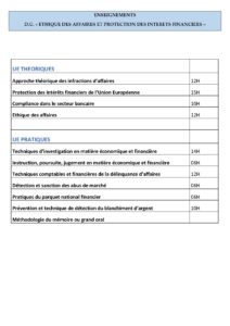 Le DU fait la part belle à l’éthique dans les affaires et en finance, aux questions de déontologie et au secteur bancaire.